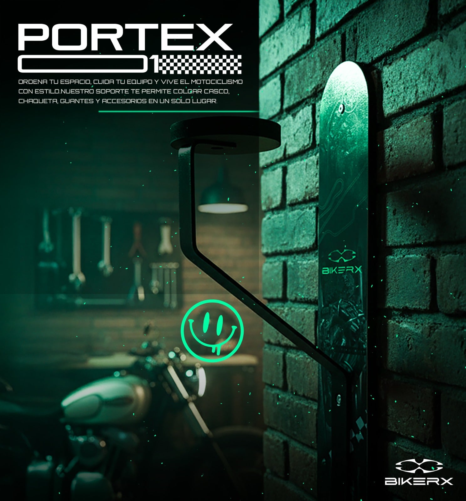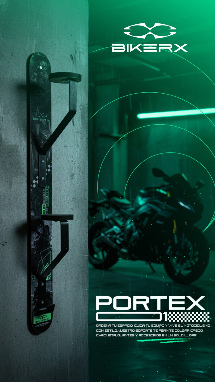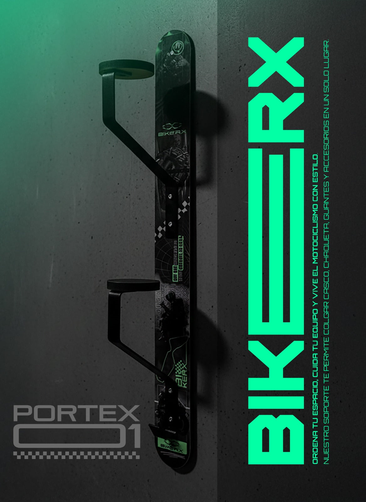 El Portex BIKERX es el soporte ideal para tener dos cascos y tus accesorios siempre en un solo lugar.